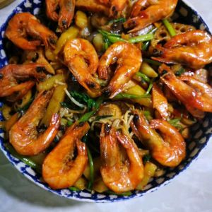 备好的青菜焯水断生,茄子,土豆,蘑菇,莲藕,青虾等菜品分别过油备用。