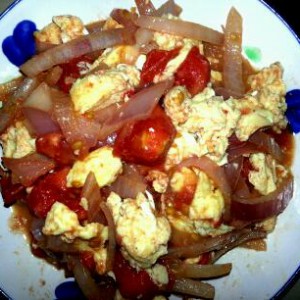 鸡蛋出锅,再加油,炒熟洋葱和西红柿,加盐面,醋,生抽老抽,放入炒好的鸡蛋,再翻炒几下出锅,OK了。