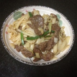 下河粉翻炒再放入牛肉、韭黄段、葱段、生抽老抽翻炒片刻即可