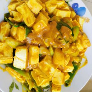 泡豆腐的时间把咖喱粉或是咖喱块用热水化开备用!如果咖喱本身有味道了就无需调味,没味道的或是口味重的可以在汁里添加适量盐!