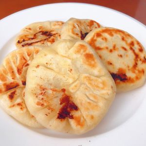 把拌好的肉葱花包进去,用手掌按压一下就可以了,平底锅或者电饼档,用油刷刷好油,油温大概40度左右就可以把饼放进去了、2.3分钟左右,翻一翻出锅