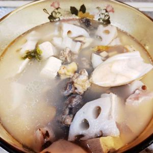 加莲藕,豆腐煲汤0.5小时,配两个时令蔬菜,凉拌马齿苋+蒜蓉南瓜尖。