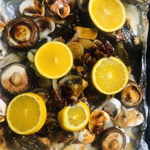 鱼画花刀,洒料酒去腥。摆葱姜、香菇、洋葱。200度上下火20分钟