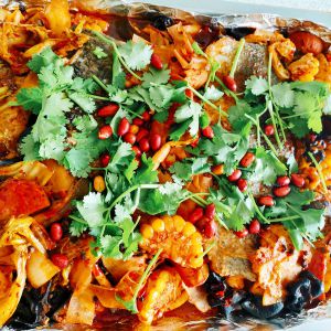 烤好后放入炒好的花生米和香菜,即可开吃了