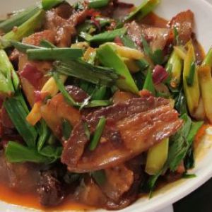 炒香下蒜苗,+味精+鸡精+盐+糖,调味,翻炒出锅