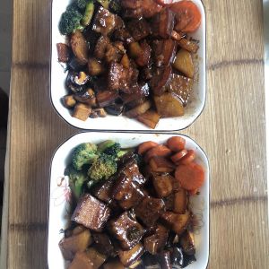 将配菜平铺在盘底四周,中间放入做好的五花肉,浇上汤汁。一道色香味俱全的红烧肉就好了,配上一碗米饭,简直太完美。我做了两盘,不然肯定不够吃的!