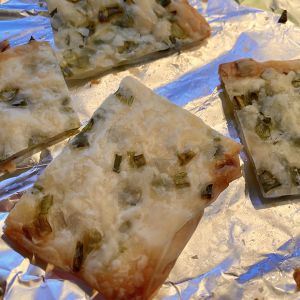 烤箱预热160度10分钟后,把擀好的薄饼放入烤箱中,20分钟后取出切成小块并翻面,继续烤20分钟就好啦。