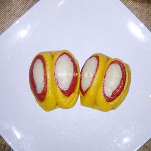 把黄色面团,用擀面棒擀开,包裹住红色面团。