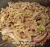 洋葱快熟时将炒好的羊肉放入,一起拌炒。同时放入干辣椒,香菜末。