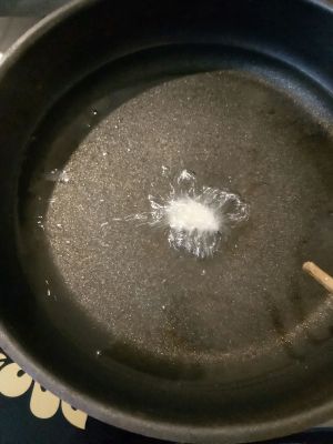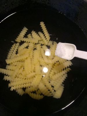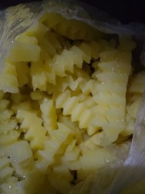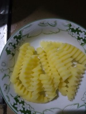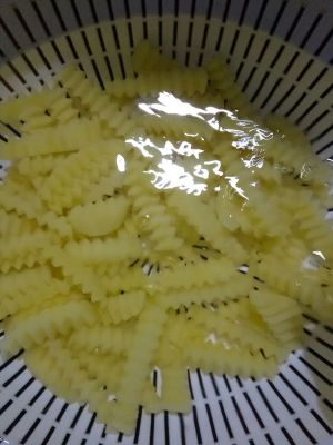 锅里倒入适量的油,先试试温度,把一个土豆条放入锅中,迅速上升,油温就好了