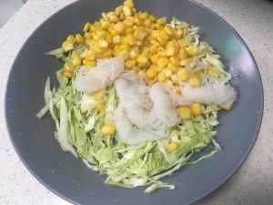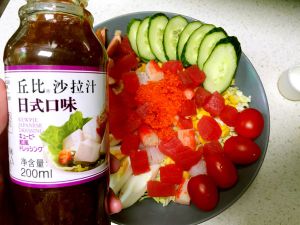 新鲜柠檬挤点汁进去,不用太多,然后倒入日式沙拉汁(要摇匀,里面有些沉底)。