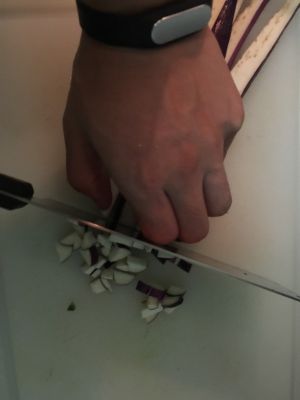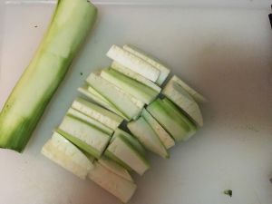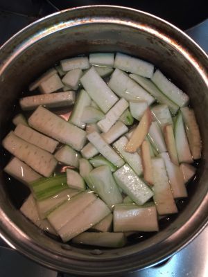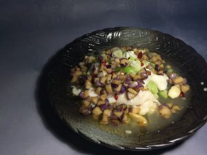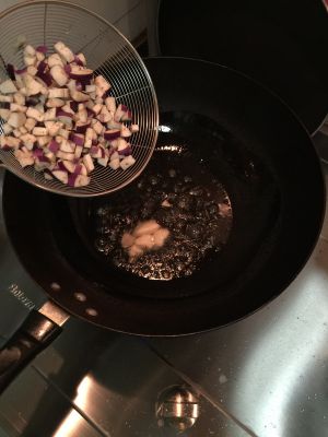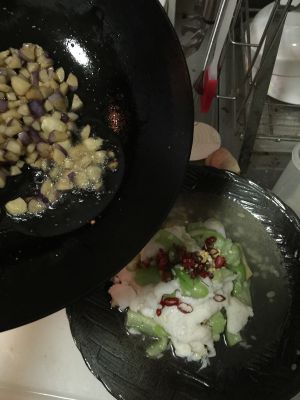翻炒后加蚝油、盐,将还沸腾的油连同茄丁一起浇在鱼肉上。因为超过茄子,油不会那么激烈的刺啦刺啦。但还是会刺激到香料和带有水分和鱼肉