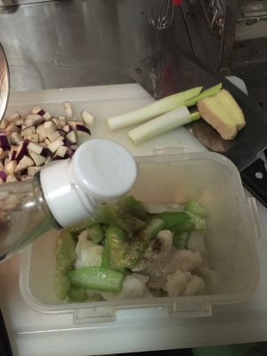装在一个可密封的乐扣盒里,加五香粉、鱼露、盐、料酒、白醋,然后盖上盖,轻轻摇晃,让汁水融化调料。这不是摇红包,也不是摇附近的人,不用那么玩儿命,轻柔。开盖可以尝尝味道,已经很鲜爽了。