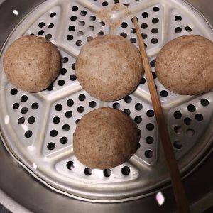 捏了5个,都很小,只有手掌那么大,放上蒸锅等待再醒发30分钟,开大火,上汽后,转中小火,蒸上15分钟!关火后等待5分钟再揭盖,以免锅盖上的水汽滴到馒头上(中间那个馒头就滴上水了,又是一有点儿泛白),热腾腾的馒头就出锅啦?哈哈