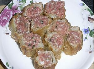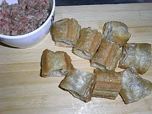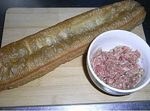 食材.油条.肉末。(肉末加酒盐鸡精生粉葱姜末拌匀)