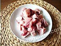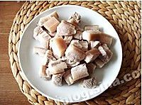 锅中水沸后,放入五花肉,水再开时撇去浮沫,捞出五花肉,用温水冲洗净血污;