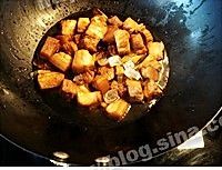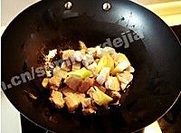 锅中油热后,放入葱、姜、花椒、八角爆锅,放入五花肉翻炒均匀;