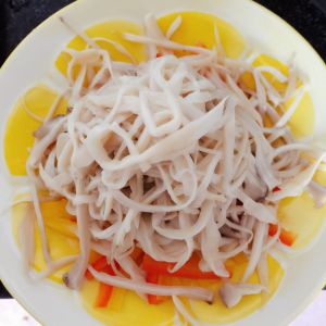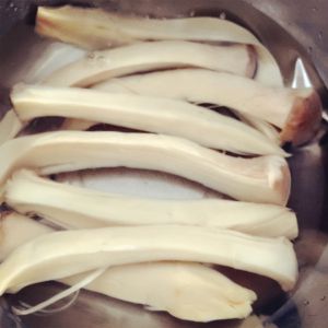 准备食材杏鲍菇,用水煮熟,放入凉的水中,一会儿要撕他