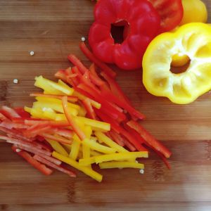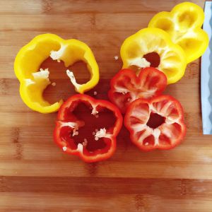 准备食材彩椒,因为它不是主菜,用不了这么多,所以我把底部和头部切掉啦,把中间的地方留着,一会儿切丝