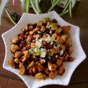 用调好的料汁勾芡,盛入盘中,洒上葱花。