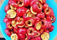 山楂洗净后,一切为二,用小刀挖去根蒂和籽。