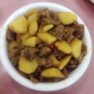 牛肉好了倒出来,放锅里倒入切好的土豆块,炖土豆。