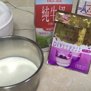 剩余的700ml纯牛奶,100ml淡奶油,倒入一小包川秀酸奶菌粉,顺时针方向调匀