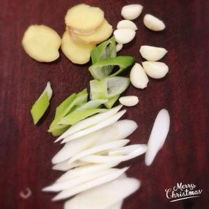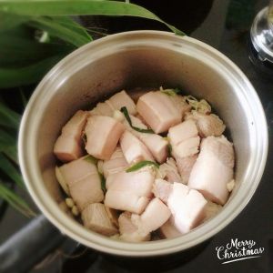 用少量油(抱歉!食材中忘写了)把葱姜蒜花椒煸香,然后,加入肉肉小翻几下