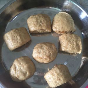 盘里抹点油不然馒头底下会粘,大火蒸20分钟,中途不要揭盖,关火后不要急着揭盖,要缓几分钟后再揭,需要注意的是锅里的水不要太少,以防蒸久水干了,因为中途不揭盖就不知道水量,这已经是蒸好的馒头了,切的不好形状就这样了,不过味道很棒哦!
