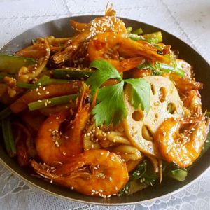 好了,放入虾,土豆条,黄瓜条,芹菜段,翻炒均匀,淋上香油,撒上熟白芝麻。准备出锅吧。