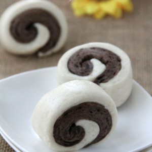 卷紧些,卷成长条后切成小段,即成双色馒头坯。将馒头生坯放在平盘中盖上保鲜膜在温暖的地方醒发20分钟。锅内注入2/3满的水,铺上笼布,大火烧开后将馒头放入,盖盖子继续大火约15分钟