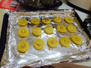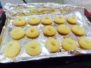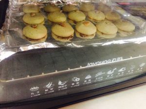 将面团分成小剂子,用手团成丸子圆,用两个指头下压就可以了,可以放上烤的花生碎,饼干不要太厚,不好吃,不容易烤熟哦