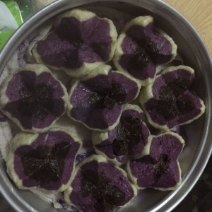 手上沾干粉,先把三色面团分别搓成条,切成剂子,用紫薯面团包入巧克力面团,最后在用白色的面团包入紫薯面团,捏口朝下,用小刀在馒头上划个十字,一定要划到能看到巧克力面团