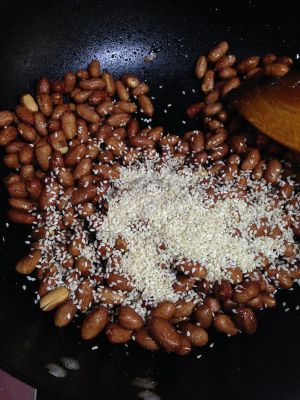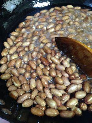 花生趁热倒入蜂蜜锅里,开极小的火翻炒至花生颗粒裹满蜂蜜
