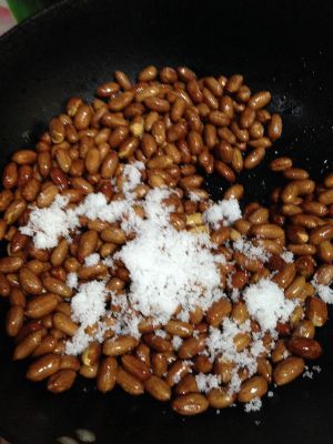 撒入白糖翻匀,使白糖颗粒融化并黏附在花生上,关火