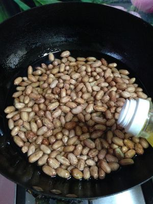 把晾干水分的花生倒入炒锅,倒入没过花生的植物油