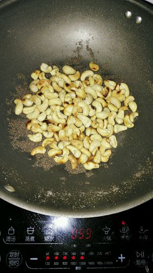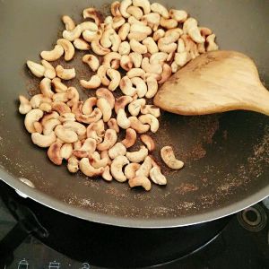 3放入空干水分的腰果不断翻炒大约10分钟左右即可。(中途不能盖锅盖,要不断翻炒)