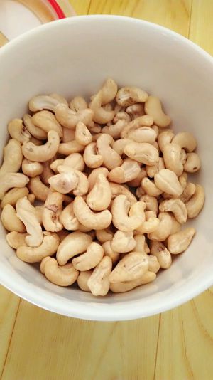 1将买回来的生腰果用清水洗净然后迅速空干水分(可以用纸巾吸干水分)