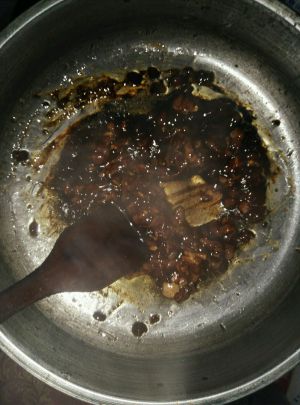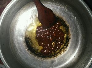 锅里放油,倒入黄豆酱,放肉搅拌
