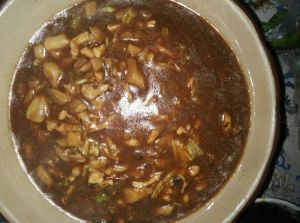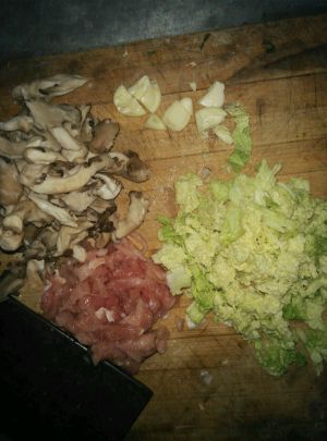 放五香面,在放适量酱油,然后加入白菜,放蘑菇搅拌