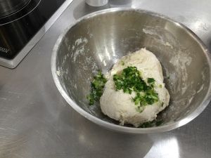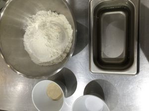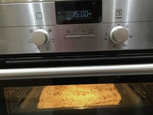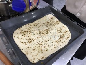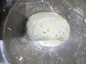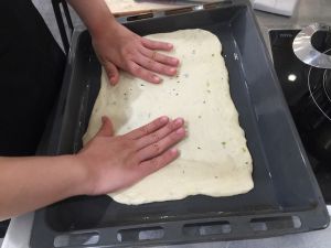 穿插把发酵好的面团从覆盖保鲜膜的盆中取出,烤箱抹匀橄榄油,面团铺平