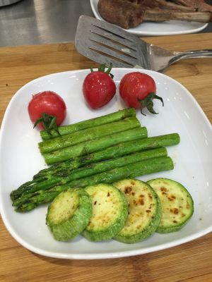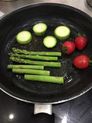 同个锅煎至西葫芦上色,小番茄两年爆皮,芦笋上色,