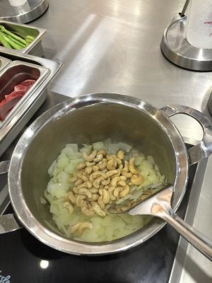 洋葱小火炒到半透明,加烘烤的腰果,烘烤的好吃