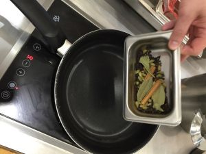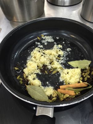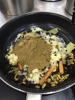 另起锅,预热,不加油,放入桂皮,香叶,黑胡椒,加文粒,丁香,翻炒