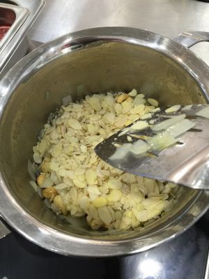 依然小火,腰果变色后加入烘烤过的甜杏仁或杏仁片,翻炒