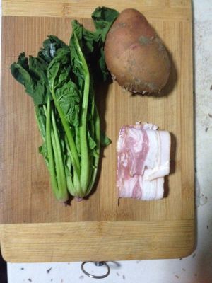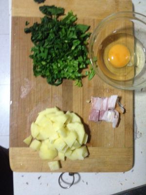 土豆丁、培根片、菠菜碎、蛋脫殼