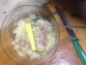 壓碎、調味、加黃油&菠菜碎拌勻(黃油可以增加口感!看自己喜好加哈