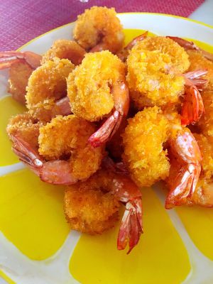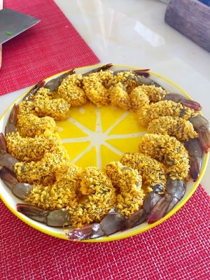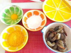 把腌制好的虾仁先沾均匀淀粉,再沾鸡蛋液,最后包满面包屑..
