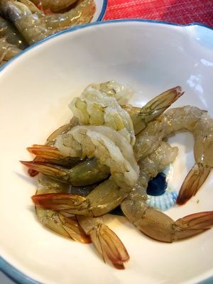 剥皮,取黑线,放入适当料酒,盐,胡椒粉,腌制半个小时。