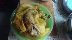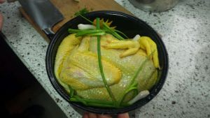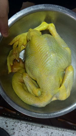 将鸡腿鸡翅向下,放入整只鸡,并将鸡脚和鸡头颈脖子放好。